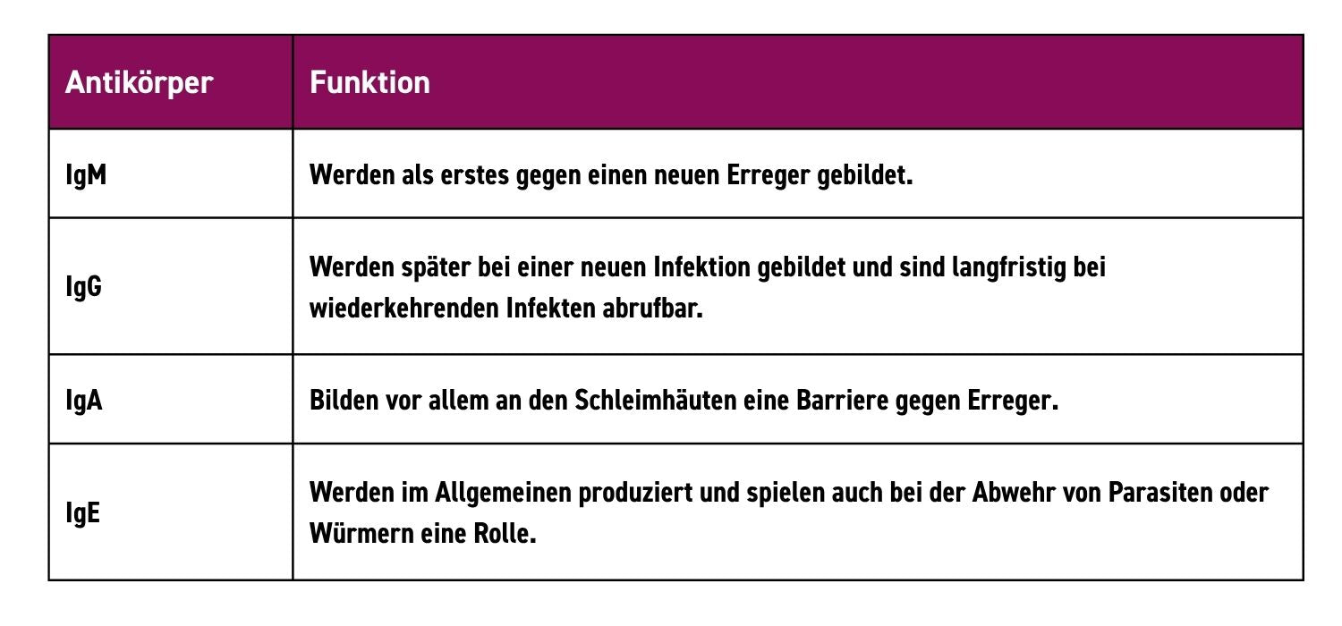 Bei den Antikörpern kennt man verschiedene Antikörpergruppen. Diese unterscheidet man mit verschiedenen Buchstaben. Man bezeichnet sie als, IgM, IgG, IgA oder IgE. Die Abkürzung Ig steht für „Immunglobulin“, das ist der Fachbegriff für Antikörper. Die Gruppen haben unterschiedliche Aufgaben und Einsatzbereiche.