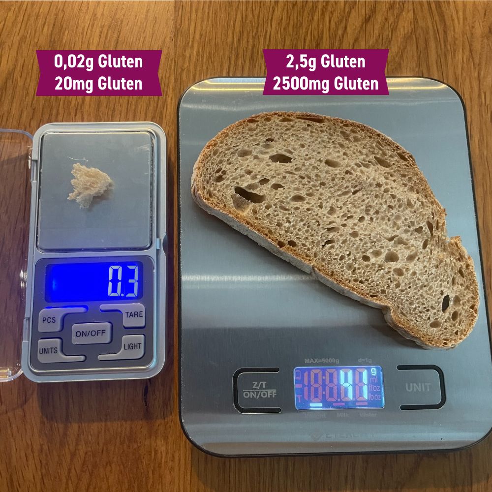 Eine Scheibe Weizenbrot hat normalerweise etwa 40g. Diese 40g enthalten ca. 2,5g Gluten. Das sind also 2500mg Gluten in einer Scheibe Brot. 20mg Gluten sind also in einem 125-ten Teil deiner Scheibe Brot enthalten, tatsächlich in weniger als einem halben Gramm (genau 0,3g) Weizenbrot! Es ist also wirklich nur ein Krümel Brot!