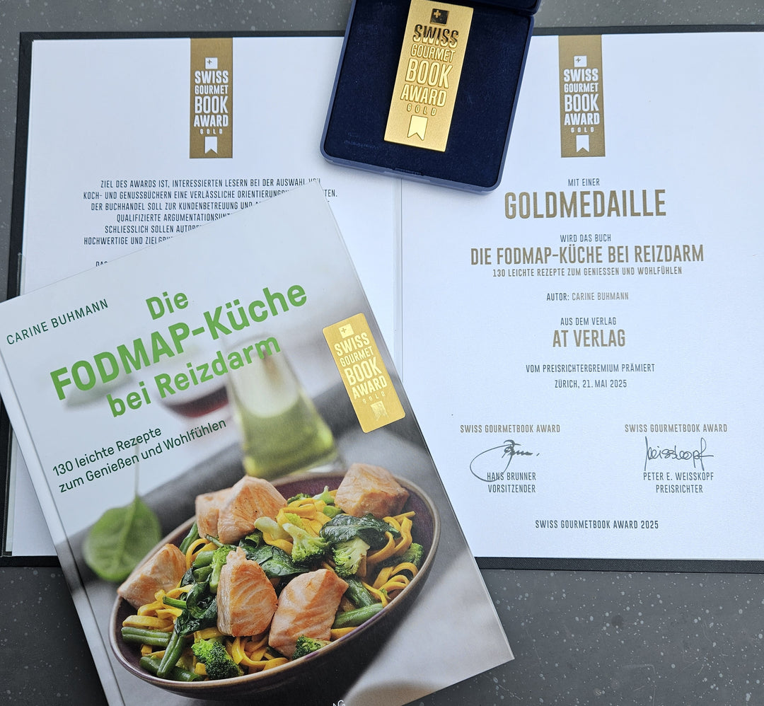 Das Buch «Die FODMAP-Küche bei Reizdarm – 130 Rezepte zum Genießen und Wohlfühlen» von Carine Buhmann wurde mit dem Swiss Gourmetbook Award in der Kategorie Gesundheit mit der GOLD-Medaille ausgezeichnet.