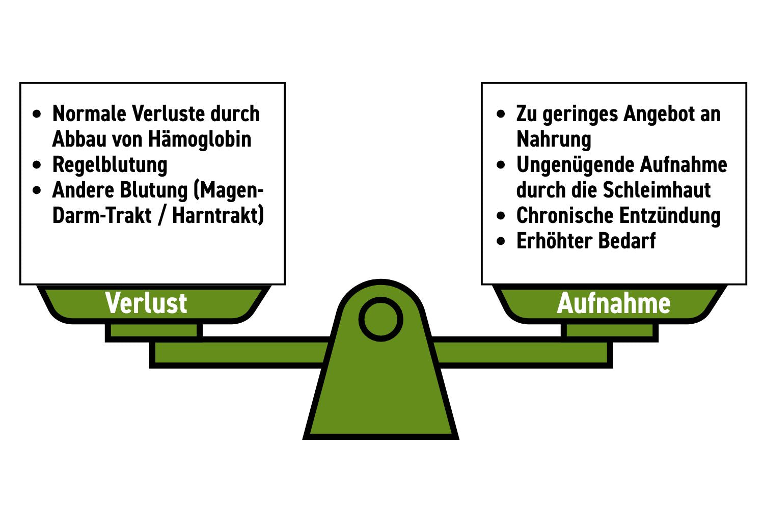 Geht dauerhaft mehr Eisen verloren als aufgenommen wird, entleeren sich mit der Zeit zunächst die Speicher, die wir vor allem in der Leber besitzen. Sind die Speicher leer, wirkt sich der Mangel auch auf die Blutbildung aus: es werden weniger und kleinere rote Blutkörperchen gebildet. Es kommt damit zur Blutarmut (Anämie). Da Frauen durch die Regelblutung immer wieder Blut und damit Eisen verlieren, liegt der Hämoglobinwert bei ihnen niedriger als bei Männern.