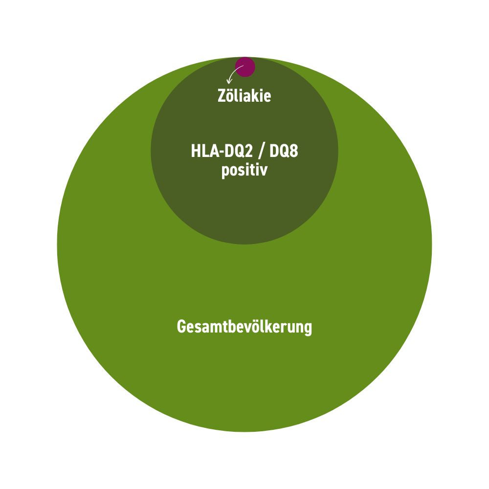 90-95% aller Zöliakie-Betroffenen tragen das Merkmal HLA-DQ2, bei den übrigen 5-10% kann man HLA-DQ8 nachweisen. Die Zahl an Personen, bei denen keines der Merkmale aufzufinden ist, aber doch eindeutig eine Zöliakie besteht, liegt im Promillebereich. HLA-DQ2 und -DQ8 sind die wichtigsten Gene, aber nicht die einzigen, die eine Zöliakie möglich machen. Diese Zahlen verdeutlichen jedoch, dass eine Zöliakie mit großer Wahrscheinlichkeit ausgeschlossen werden kann, wenn man weder HLA-DQ2 noch -DQ8 nachweisen kann.