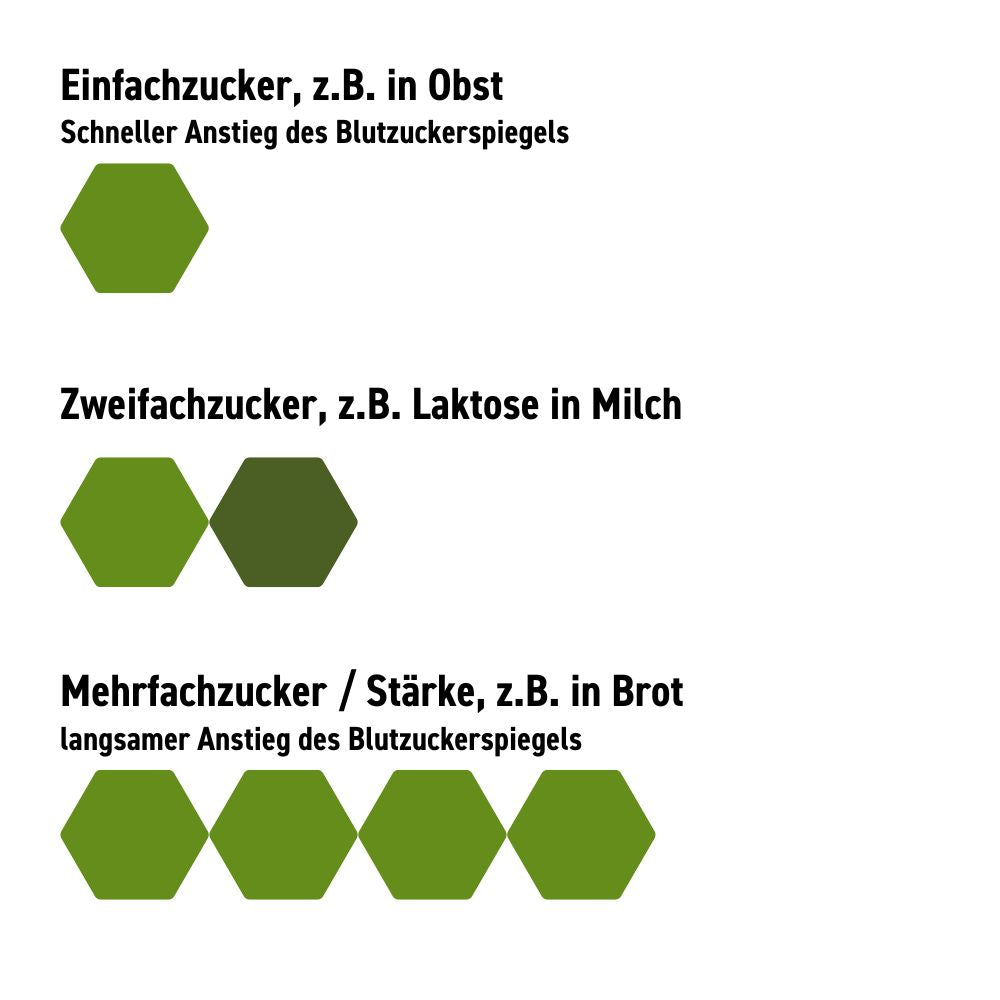 Zu den Kohlenhydraten zählen die verschiedenen Zucker und Stärken. Einfache Zucker kann unser Darm sehr leicht aufnehmen, der Blutzucker steigt daraufhin relativ schnell an. Das ist z.B. beim Traubenzucker (Glukose) der Fall. Doppelzucker müssen zunächst gespalten werden und können danach erst als Einfachzucker resorbiert werden. Ein Beispiel dafür wäre der Milchzucker (= Laktose), der durch das Enzym Laktase in die Bestandteile Glukose und Galaktose zerlegt wird. Je komplexer ein Kohlenhydrat ist, also je mehr chemische Bindungen es hat, die vor der Aufnahme an der Darmschleimhaut gespalten werden müssen, umso länger dauert es, bis der Blutzuckerspiegel ansteigt.