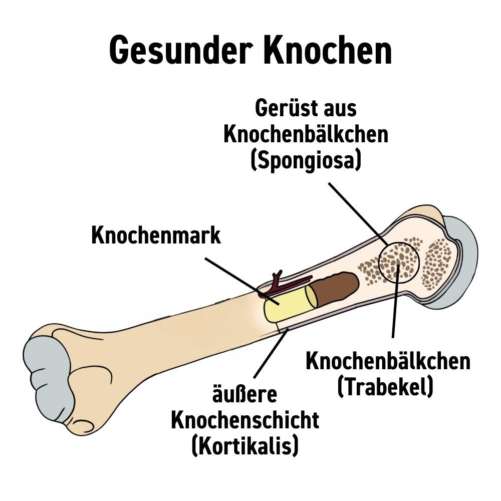 Die großen Knochen in unserem Skelett bestehen aus einer festen Außenschicht, der Kortikalis, und einer löchrig-schwammartigen Innenstruktur, der Spongiosa. Die Spongiosa besteht aus den Knochenbälkchen (=Trabekel), die die Zug- und Druckkräfte, die auf den Knochen wirken, optimal abstützen. In den „Löchern“ dazwischen sitzt das Knochenmark, das für die