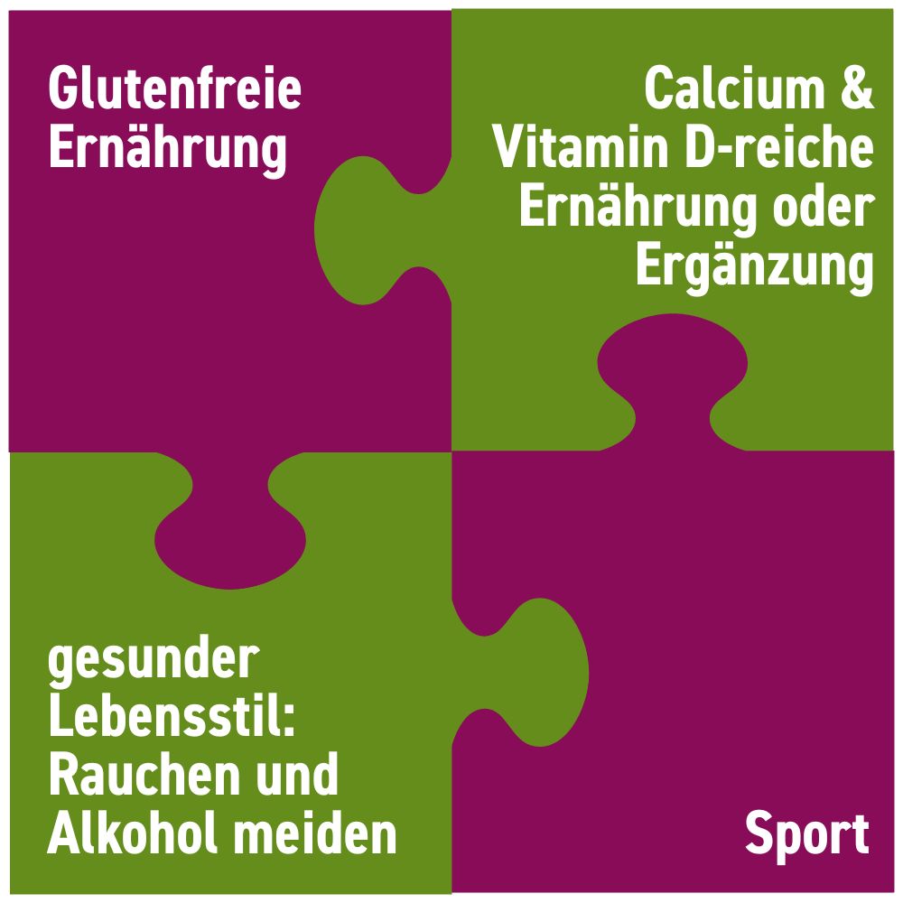 • Je nach Alter ist eine entsprechende Diagnostik sinnvoll, um therapeutisch entgegenwirken zu können. Dabei ist die wichtigste Maßnahme die dauerhafte und konsequente Umsetzung der glutenfreien Ernährung.