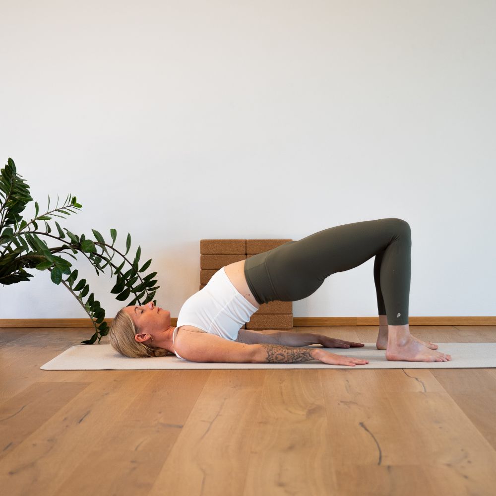 Die Schulterbrücke ist eine sanfte Rückbeuge, die den Brustkorb öffnet und die Wirbelsäule mobilisiert. Sie stärkt Beine und Rücken, dehnt den Bauchraum und kann die Verdauung anregen. Diese Haltung wirkt entspannend und fördert das Wohlbefinden.