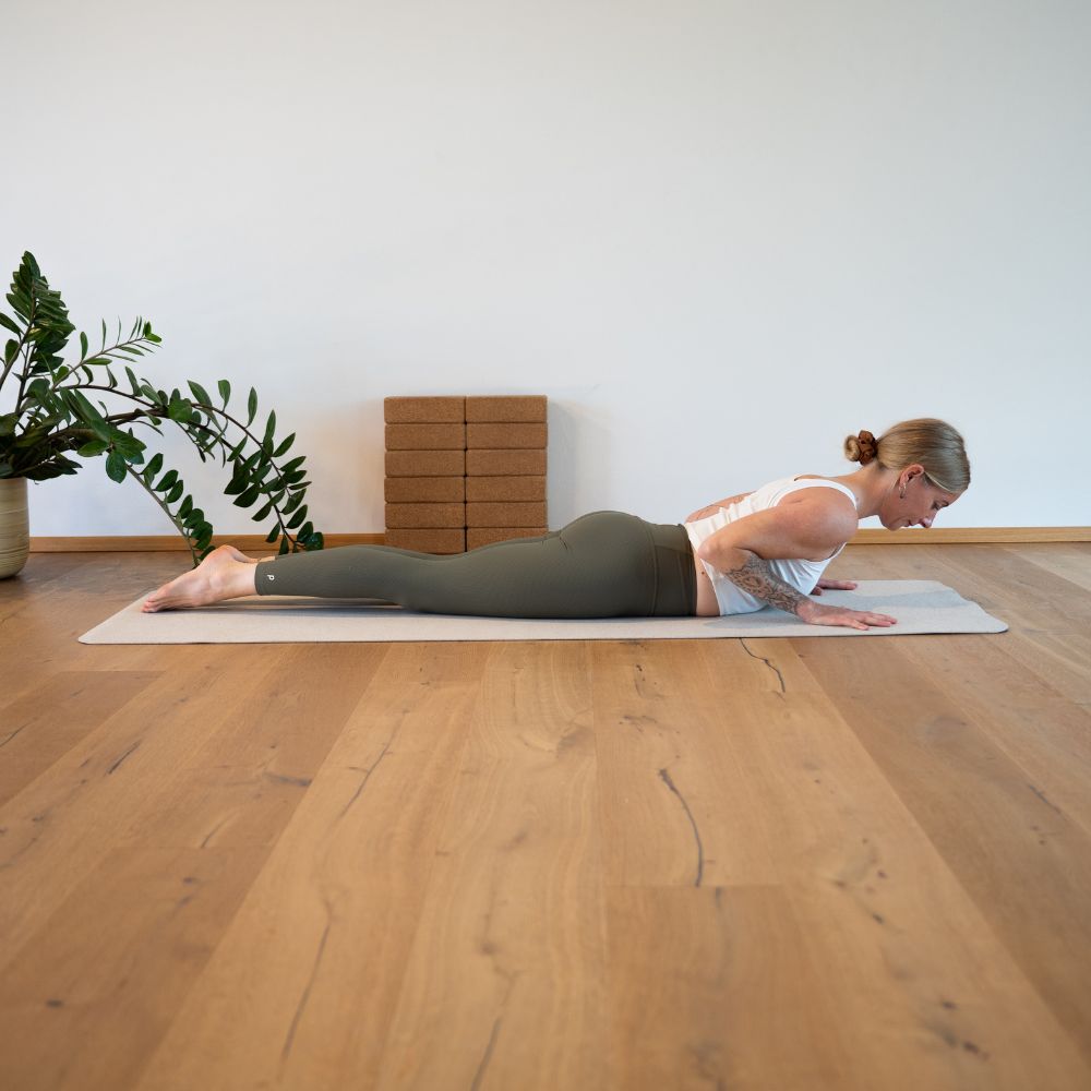 - Lege dich auf den Bauch, die Beine lang ausgestreckt und die Fußrücken auf der Matte.