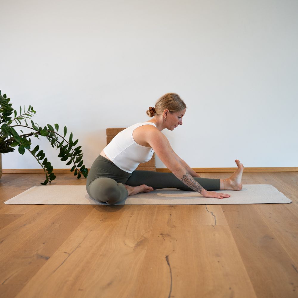 Die einbeinige Vorwärtsbeuge im Sitzen ist eine sanfte Dehnung, die besonders den Rücken, die Beinrückseiten und den Bauchraum entspannt. Sie hilft, Verspannungen zu lösen, den Geist zur Ruhe zu bringen und die Verdauung zu unterstützen. Diese Übung eignet sich gut, um achtsam in den Körper hineinzuspüren und Stress abzubauen.